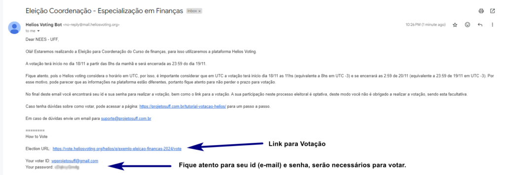 Você receberá o link para a votação, seu id e sua senha pelo email informado na matrícula na especialização.