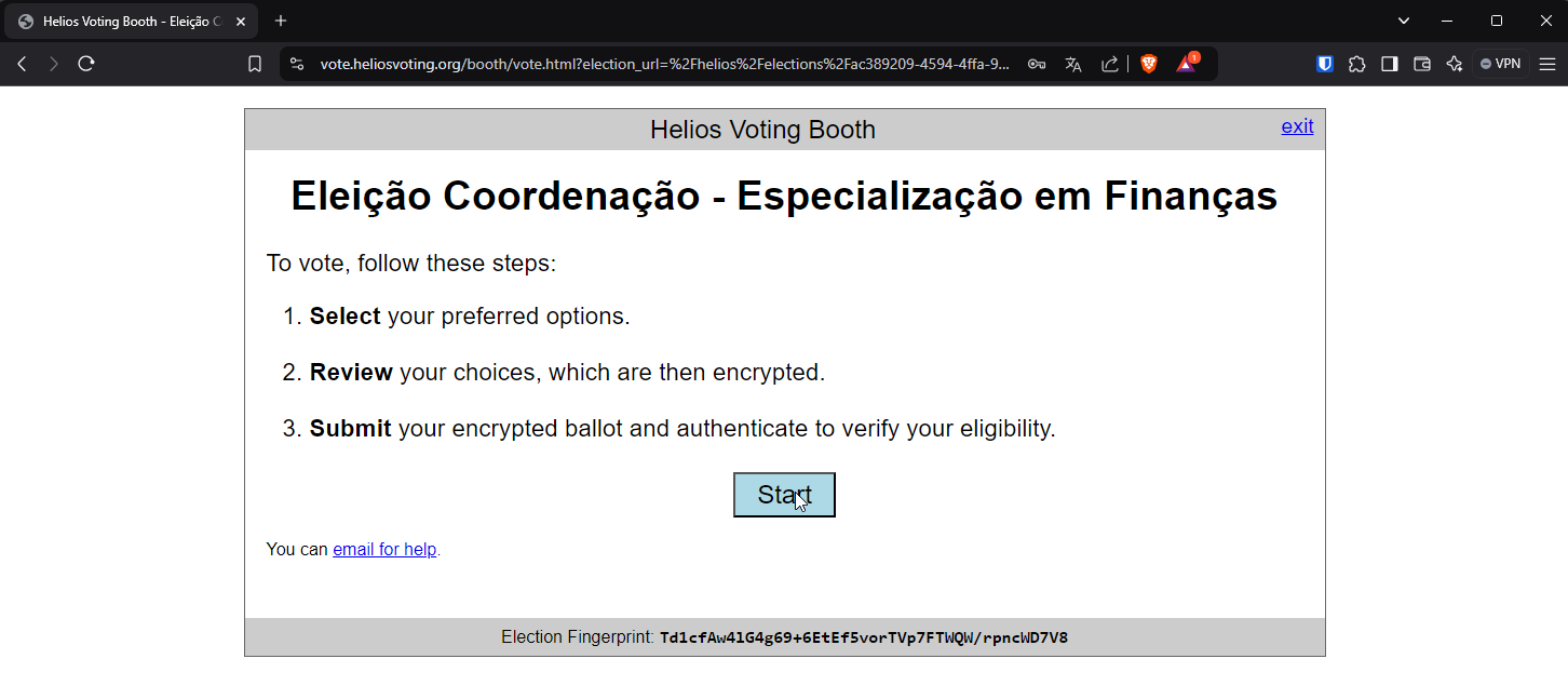 Ao digitar seu id e senha, será exibida a tela de início com as informações da eleição, clique no botão start.