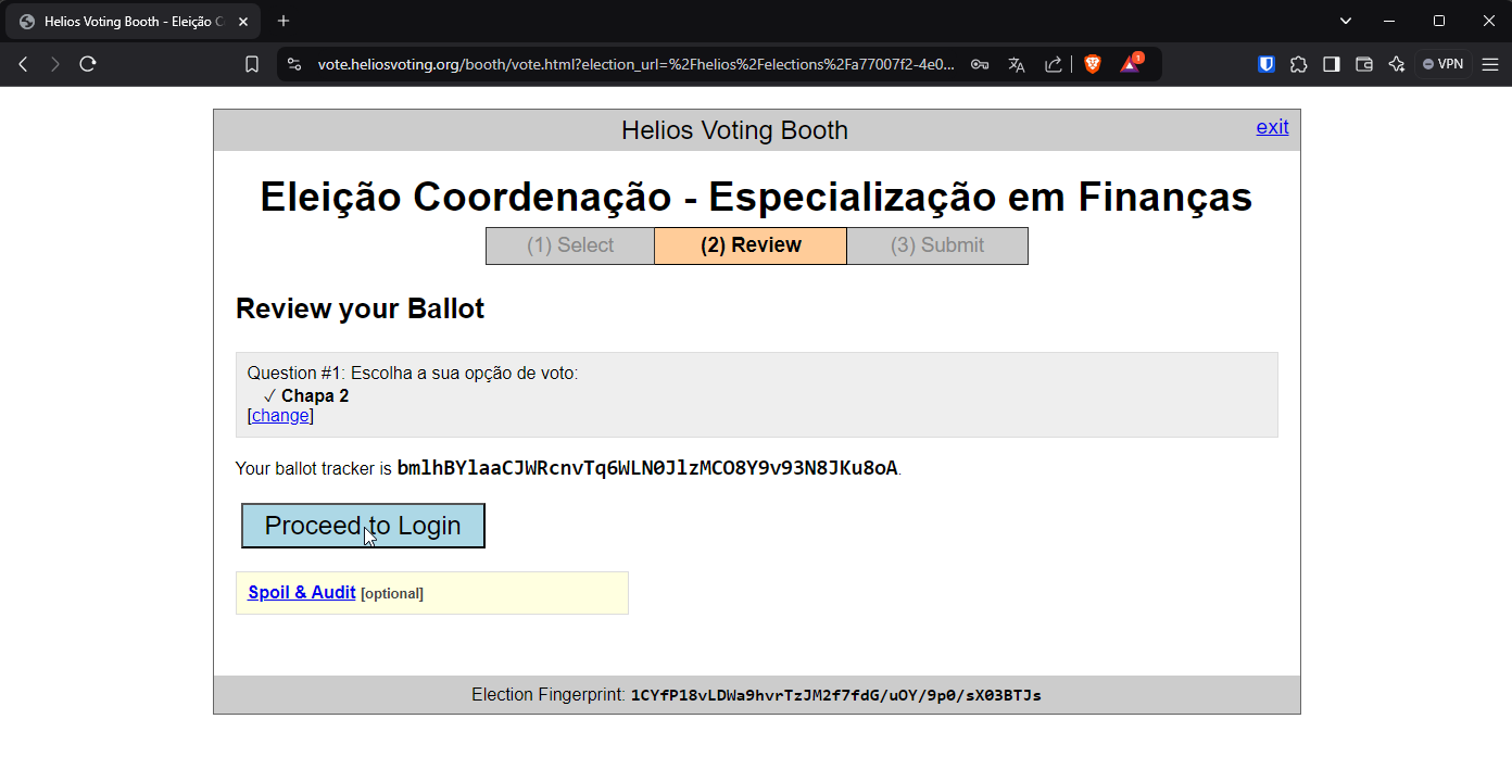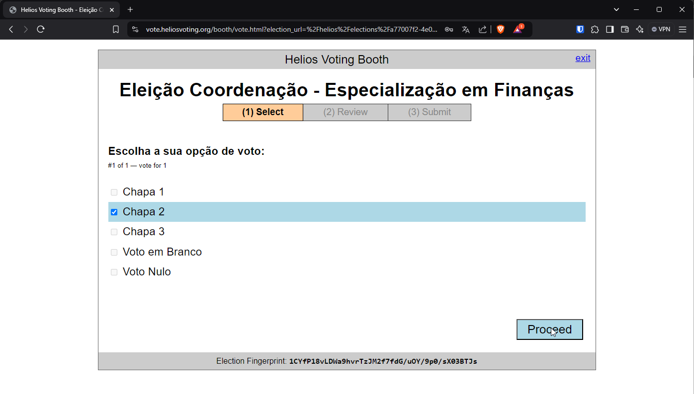 Escolha a sua opção de voto entre as disponíveis e clique em Proceed: